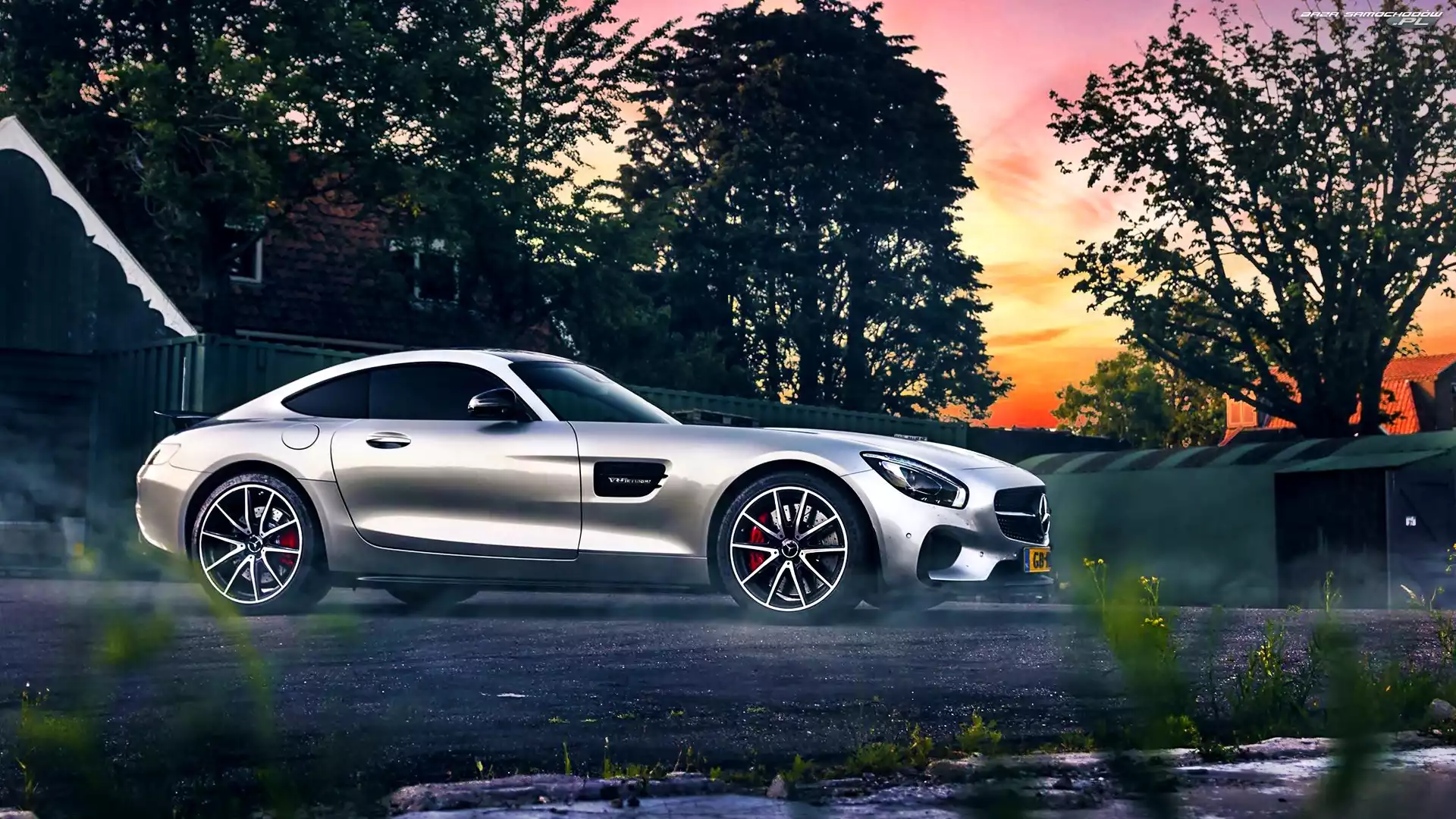 Dom, Drzewa, Banz, Mercedes, Zachód Słońca- Zdjęcia samochodów