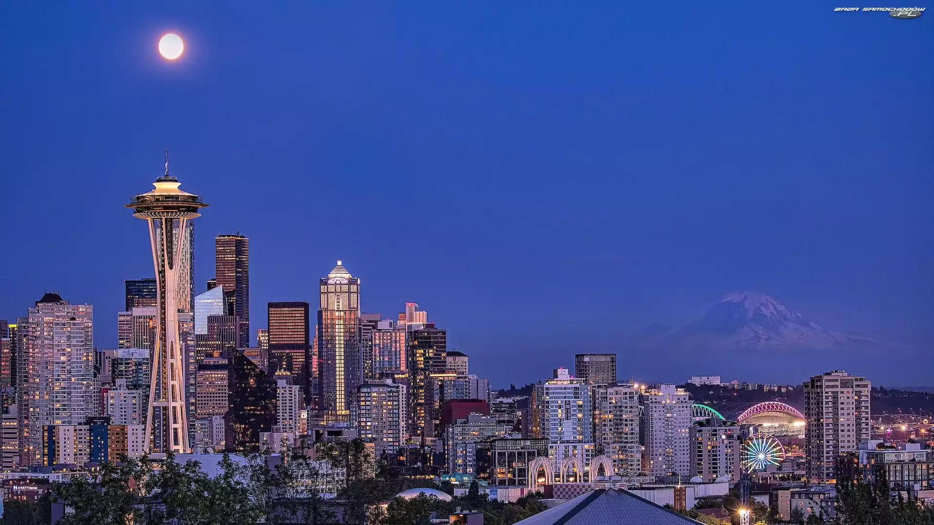 Pełnia, Wieża, Stany Zjednoczone, Księżyc, Wieżowce, Seattle, Stan Waszyngton, Space Needle- Zdjęcia samochodów